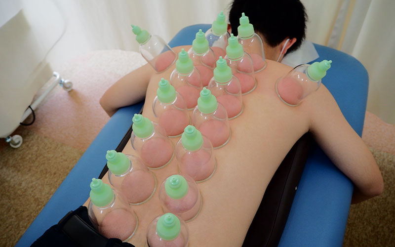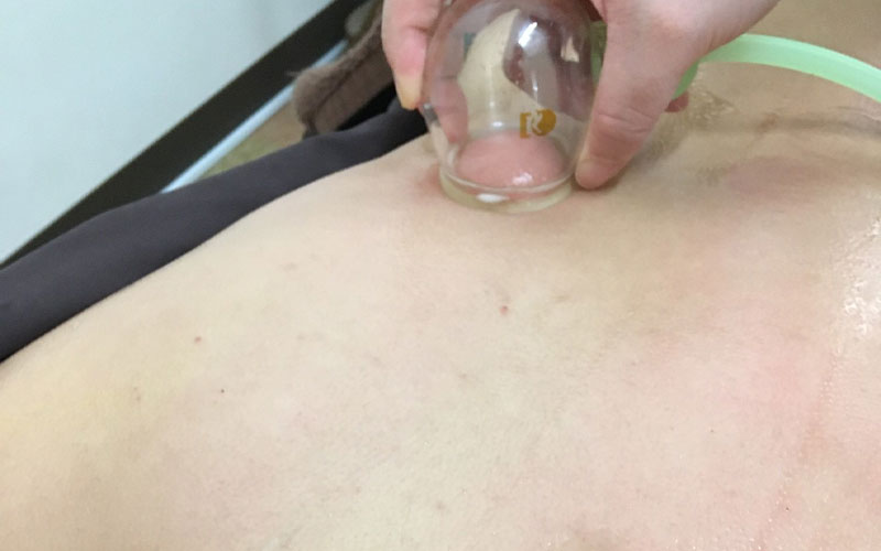 カップを真空状態にして身体に吸着させることで、動きの悪くなった表層の浅筋膜の柔軟性を向上させます。またカップ内の陰圧により毛細血管が拡張することで、血流が改善され広範囲の疲労物質が流れやすくなります。施術後、皮膚に毛細血管が拡張したあとのアザがのこります。1〜2週間のアザが消えるタイミングで繰返し施術を受けていただくのがオススメです。