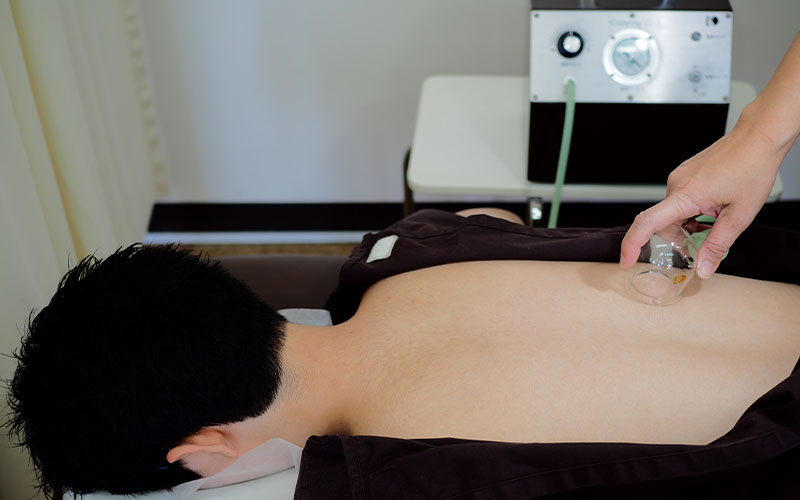 スライドカッピング専用の吸引器を用いてカップを肌に吸着させスライドさせます。肩・背中・腰・下肢の浅筋膜の癒着を剥がし(筋膜リリース)広範囲にアプローチすることができます。肩こり、腰痛、疲労などの改善にオススメです。